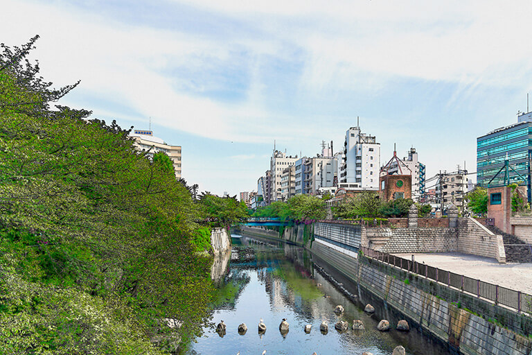 かつて水車が並ぶ農村地帯だった目黒川沿いのエリアは、今では桜並木の名所として知られるようになり、開花時にはたくさんの人が訪れるようになりました。